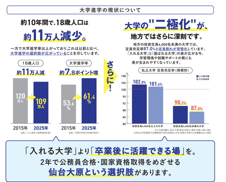 また、大学の二極化も深刻となっています。特に地方では収容定員4,000名未満の大学では定員充足率87.0%(※2)と定員割れが常態化しています。「入れる大学」と「選ばれる大学」の差が広がる今、学習環境や就職サポートの質にも違いが生まれやすくなっています。