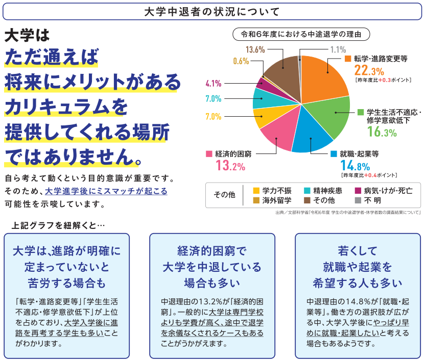 第三に、若い世代の価値観が大きく変化していることも見逃せません。中退者のうち14.8%が、早期の就職や起業を理由に中退しており、大学での理論中心の学びよりも、より早く実社会で通用するスキルを身につけたいと考える傾向が強まっています。