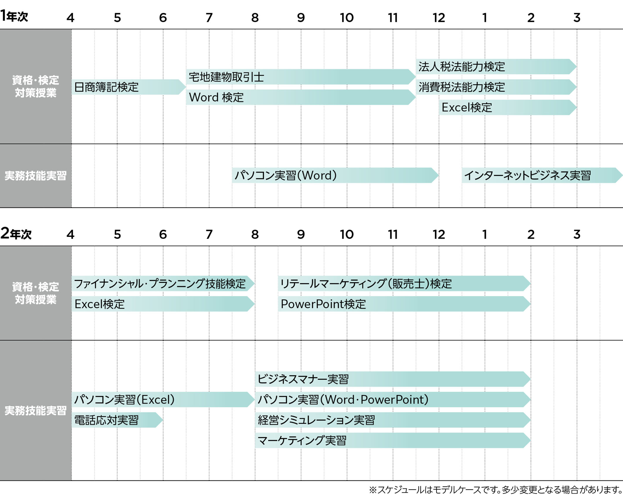 経理実務実習/経営シミュレーション実習/マーケティング実習/パソコン実習(Word・Excel・PowerPoint)/会計ソフト実習/ビジネスマナー実習/インターネットビジネス実習
