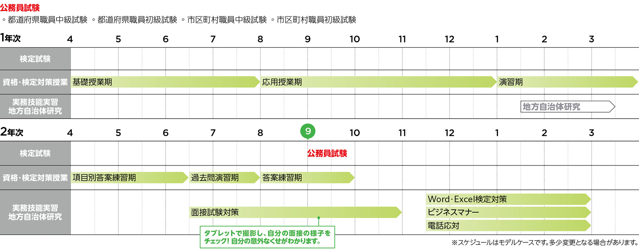 都道府県や市区町村職員、学校事務、警察事務など各自治体で地域の暮らしに貢献する地方公務員の高卒程度(初級)および専門・短大卒程度(中級)レベルまでを視野に入れ、合格をめざします。