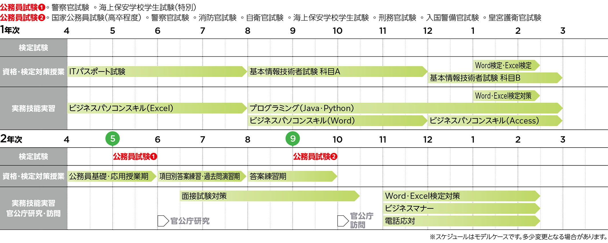 1年次にITの知識習得および資格取得を行い、2年次から公務員試験対策に切り替わり、ITスキルを兼ね備えた公務員をめざします。